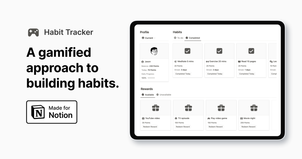 This Notion template helps you stay motivated by tracking your streaks and providing a system for rewarding your progress.